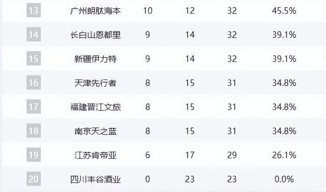 底部陣營慘烈廝殺:天津、福建、同曦三隊同為8勝15負,江蘇(7勝16負)與四川(6勝17負)則深陷泥潭,保級壓力山大。