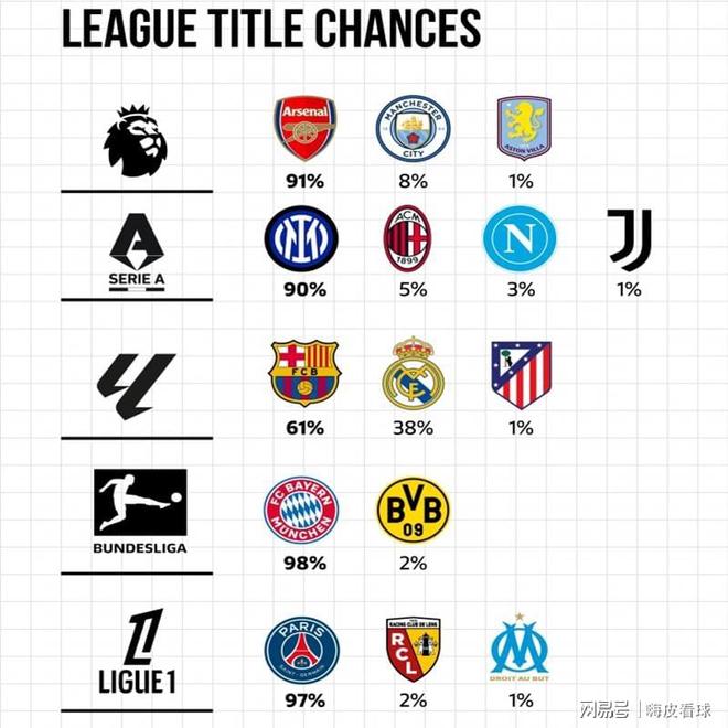 根據《歐洲俱樂部指數》統計機構的分析,歐洲五大聯賽中,有4個冠軍的爭奪基本上沒有懸念,均超過九成,巴黎聖日耳曼和拜仁慕尼黑奪冠機會甚至接近百分之一百,真的是這樣嗎?
